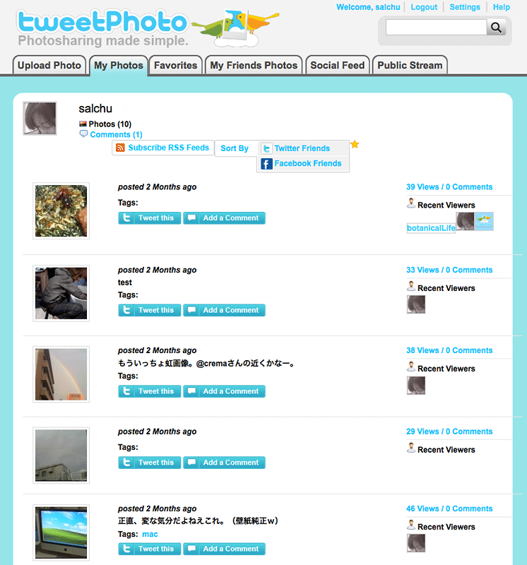 そしてそのTwitPicにしてもTweetPhotoにしても、トップページから自分のTwitterアカウントでサインインするとユーザページができあがっていて、今までアップした写真が見られるという寸法。もちろん、そのページでもアップロードはできるし、対応していればメール投稿することも可能。