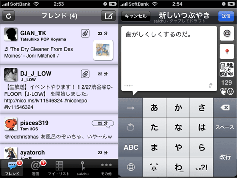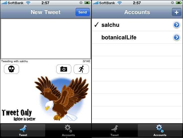 下は、左:新規ツイート画面、右:アカウント管理画面