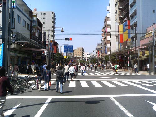 順が前後しますが、亀戸駅から天神さんに向かう明治通り。休日は歩行者天国になっているらしく、けっこうなにぎわい。露店も数多く出ていましたが、なぜかおばちゃんが靴や服ばかり売っていたような。