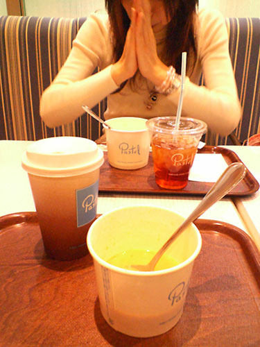 写真は、2階にあるパステルの喫茶で一息の図。同行の女子、ごちそうさまの瞬間。ここのおかゆやスープはなかなかでした。
