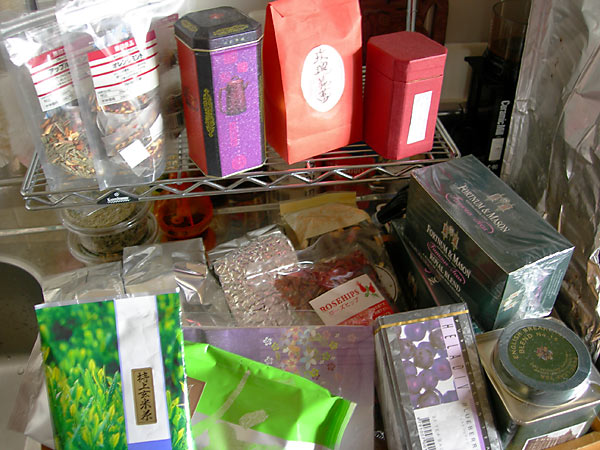 在庫だけでもコレ。写っているのは、紅茶・煎茶・玄米茶・そば茶・ローズヒップ・ジャスミン茶(×4)・牛乳茶、あとは名前が分からん…