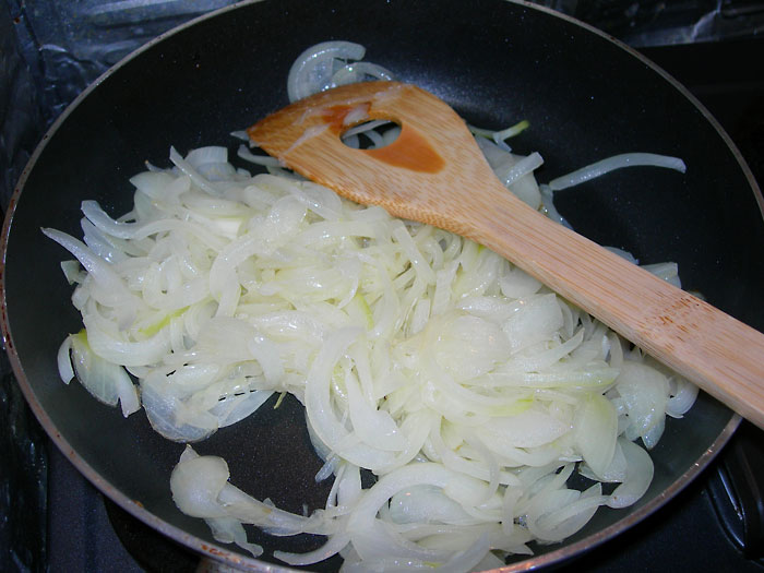 炒めタマネギと言えばあのメニューやこのメニューがあるが、今回はアレ。タマネギ二個を使っての勝負です。みじん切りなら火の通りも早いんだけど、私の目はとてもデリケートで鼻水が止まらなくなっちゃうため、薄切りで我慢してもらうことにした。我慢するのは私だが。
