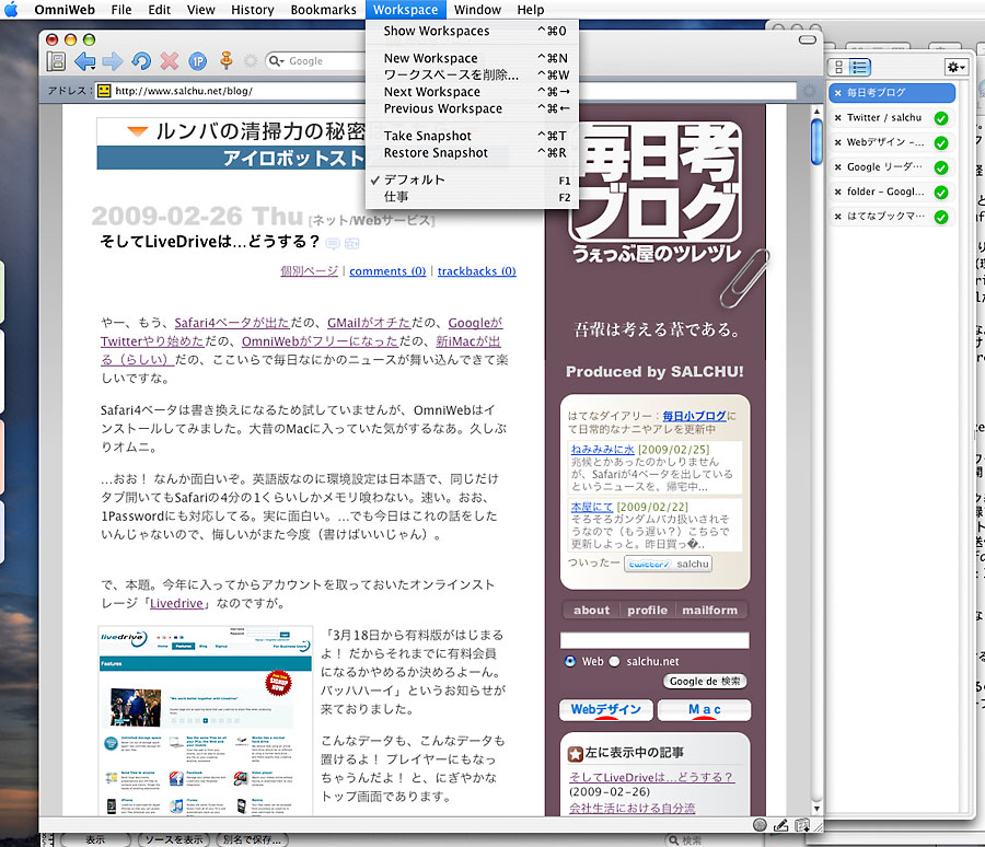 - 前述したワークスペースの切り替えは便利だけれど、管理や動作がちょっと独特。で、設定したワークスペースのほうでOmniWebを終了すると、次回起動時はそのワークスペースで立ち上がるので、何十枚もタブがあるワークスペースの場合は最悪。全部のタブの読み込みが終わるまで風車クルクル。速いマシンはいいけどさ…。